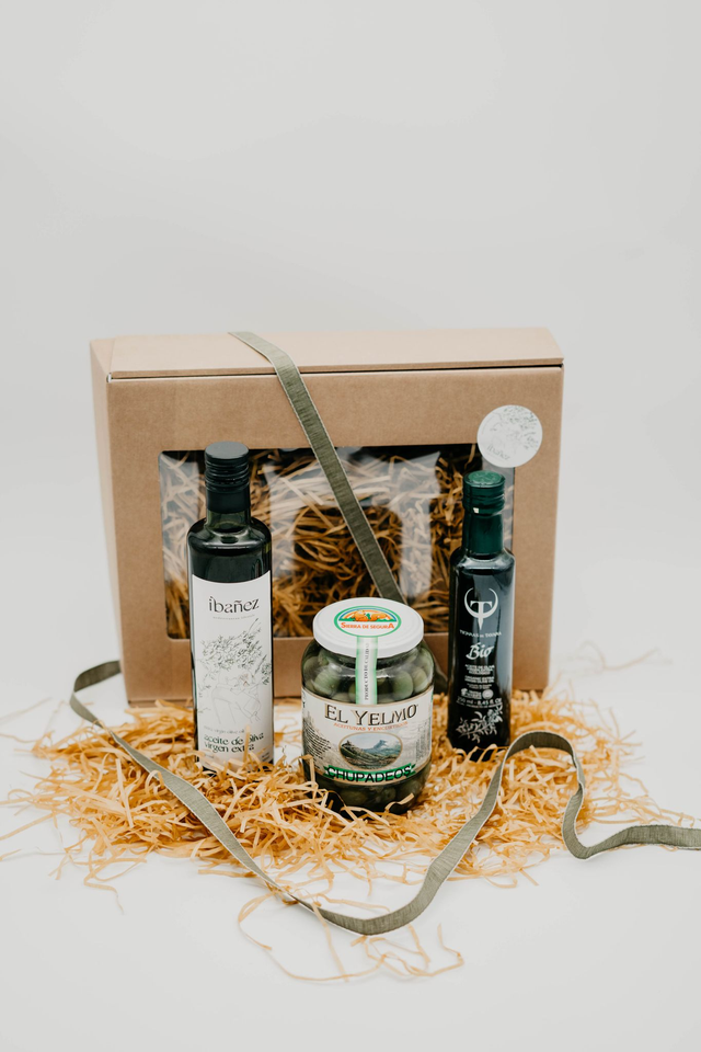 Dieser Geschenkkorb besteht aus einer Flasche Ibañez Olivenöl (500 ml) aus den Olivenhainen meines Vaters, einer Flasche Bio-Olivenöl (250ml) und einem großen Glas Oliven nach Wahl. Deine Auswahl wird liebevoll von Hand in einem hochwertigen Karton verpackt.